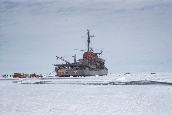 The Edisto sits in the midst of the ice shelf.____________ __________A classic Navy helecopter passes by the