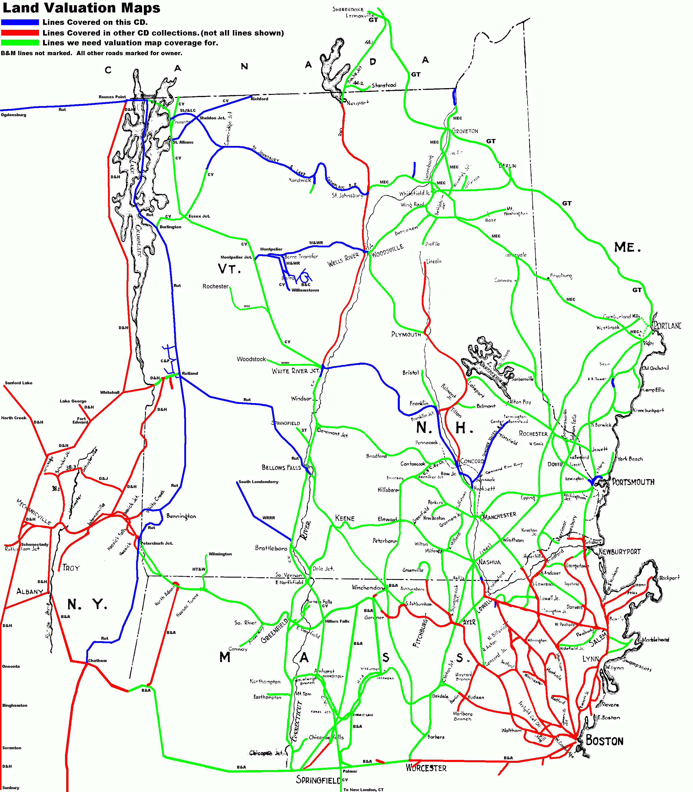 The primary featured railroads of this offering are COMPLETE sets of maps for the following railroads: Rutland Railroad; St. Johnsbury & Lake Champlain Railroad; Montpelier & Wells River Railroad; Barre & Chelsea Railroad; Clarendon & Pittsford Railroad and West River Railroad. Also included on this CD are maps from the Central Vermont Railroad (Williamstown Branch; Richford Branch; part of the Burlington & Lamoille Branch); Delaware & Hudson Railroad (the missing Washington Branch maps to accompany TC-4); Boston & Maine Railroad (Northern RR complete, Concord to White River Jct.); Suncook Valley Branch; Hooksett Loop Br.; Maine Central (Beecher Falls Branch in VT).