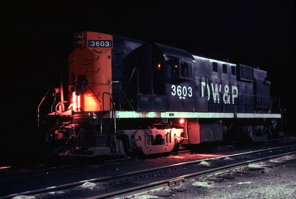 Digitally color corrected night photo of DW&P 3603 at White River Junction, VT.